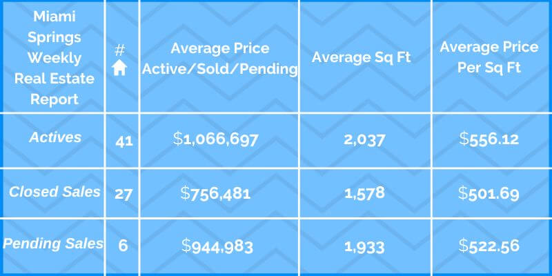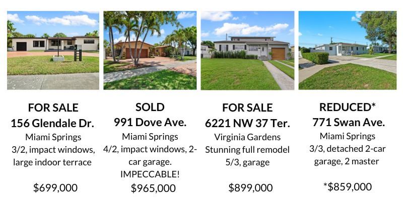 Decreased interest rates and an uptick in inventory as the best time to buy (historically) approaches! There are forty-one (41) active listings in the Miami Springs/Virginia Gardens real estate market this week. Prices remain strong for sellers as shown by the sixteen (16) active listings over $1million. We are, however, seeing more price decreases on an active listings. At fifteen (15), almost 40% of the active listings have had a price reduction, one (1) this week.